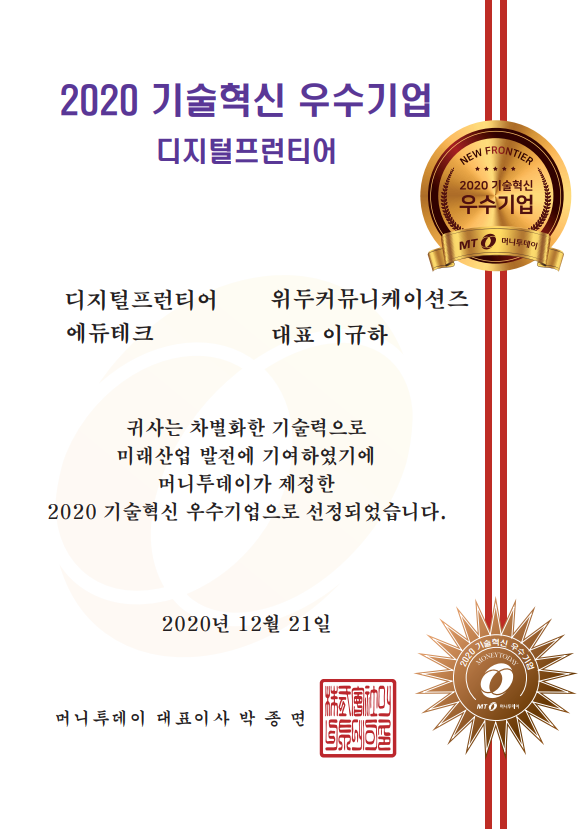 2020 기술혁신 우수기업 페이지 정보 작성자 WeDu 댓글 0건 조회 6,384회 작성일 21-12-31 12:58 본문 2020-12-21 2020 기술혁신 우수기업 디지털프런티어 에듀테크 머니투데이 대표이사 List Previous2020 소년한국 우수 어린이 도서 선정 21.12.31 Next2020 서울산업진흥원 2020 DMC어워드 21.12.31