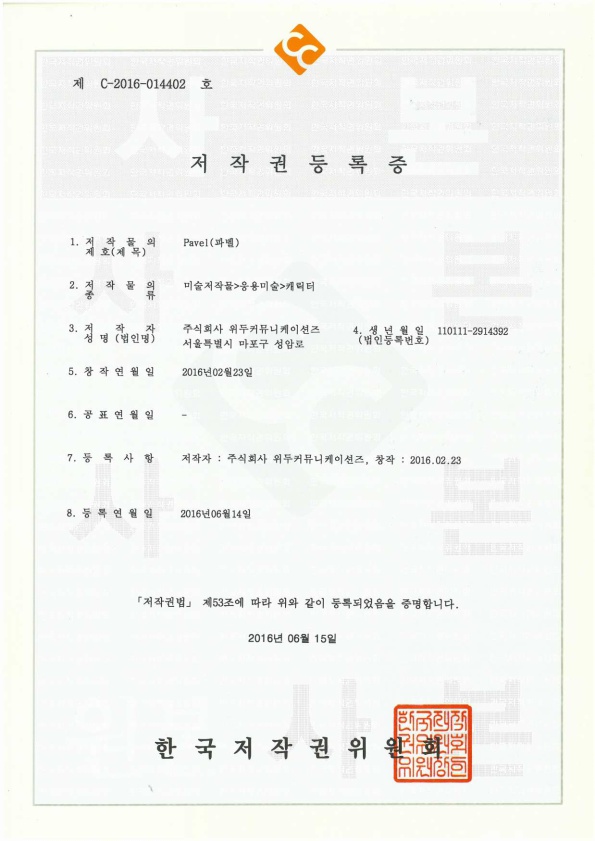 [한국/저작권] 파벨 페이지 정보 작성자 WeDu 댓글 0건 조회 6,324회 작성일 19-05-30 19:11 본문 2016-06-15 저작권 C-2016-014402 파벨 / 미술저작물>응용미술>캐릭터 List Previous[한국/저작권] 누미 19.05.30 Next[한국/저작권] 월터 19.05.30