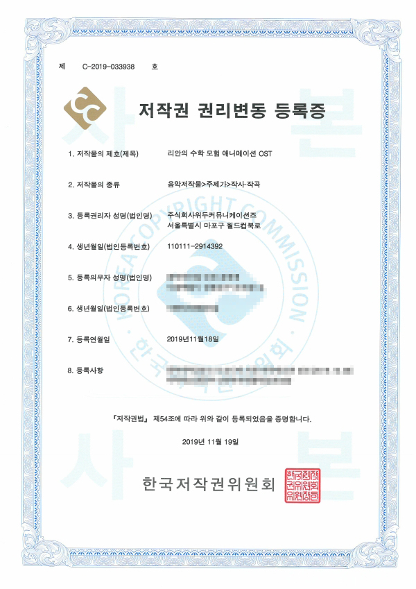 [한국/저작권] 리안의 수학 모험 애니메이션 OST 페이지 정보 작성자 WeDu 댓글 0건 조회 6,747회 작성일 19-11-25 13:54 본문 2019-11-18 저작권 C-2019-033938 음악저작물>주제가>작사·작곡 List Previous[한국/저작권] 리안의 수학 모험 여정의 시작 1,2,3,4,5 21.12.31 Next[한국/저작권] 애니메이션 리안의 수학 모험 19.11.25